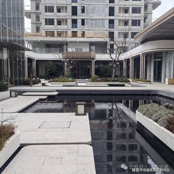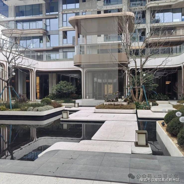 小区内部有下沉式浮岛庭院,周边设置风雨连廊,一侧为飞瀑景观,营造流水入园的既视感,另一侧为观景吧台,让人有置身水幕剧场的感觉。