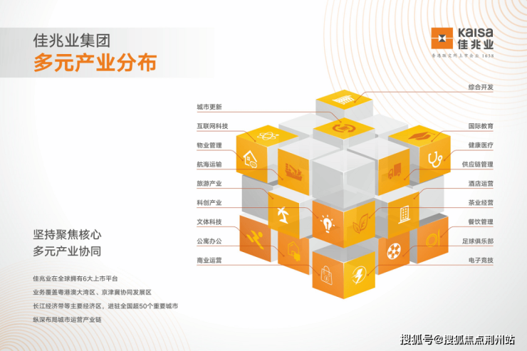 2012年起,佳兆业就提出以城市更新为主要版块,向多元化产业进军的战略,积极打造大健康板块、大文体板块、大生活板块,努力革新都市生活模式,为人们带来科学、健康、有趣而高品质的生活。目前,佳兆业已涉足超过20个产业和细分领域。
