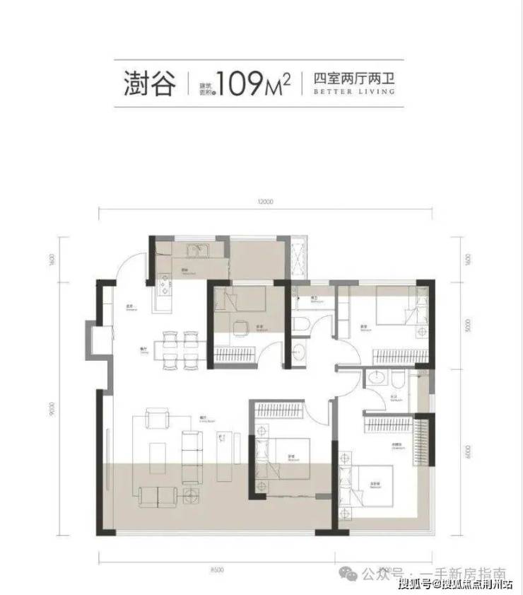 2号楼两个端头边户和1号楼东边端头户型,南北通透,三开间朝南,建面虽然只有109平却做了四房,还有大横厅,而且每一个房间空间都比较阔绰。