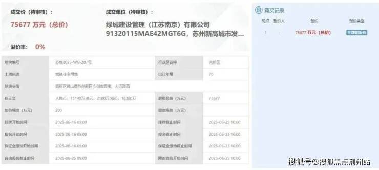 苏地2025-WG-Z07号地块:绿城&苏高新狮山7号地块项目,即,苏地2025-WG-Z07号地块,位于高新区狮山商务创新区今创启园南、大运路西,是6月25日,绿城&苏高新以底价75677万元竞得,成交楼面价20500元/平。