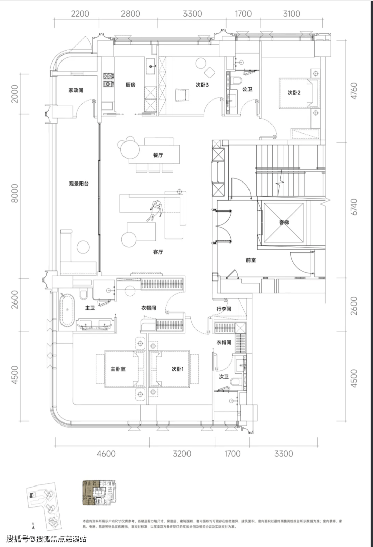 户型结构,采用核心筒+边柱设计,确保户型多样化,且赠送率、阳台率最大化,算上专梯入户使用率预计能达100%左右。