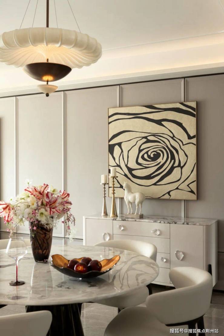 客厅背景墙、玄关柜、卧室门一体化设计,构筑出连贯舒展的视觉界面。功能隐于行制,秩序藏于美学,生活的细碎痕迹被温柔消隐,只余纯净与从容。