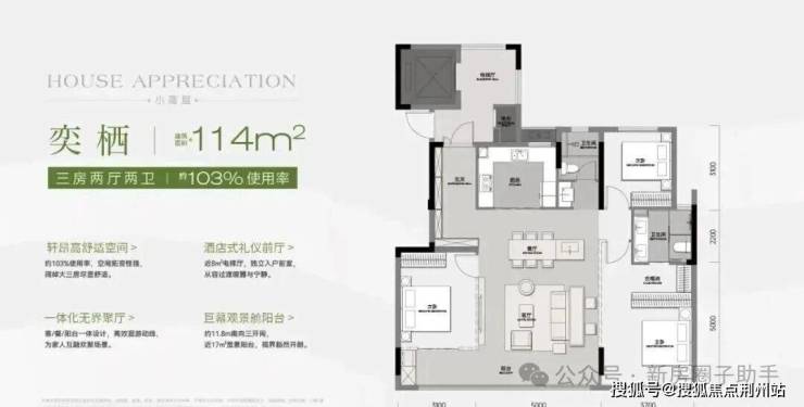 建面约114平三房两厅两卫,优化后约103%的使用率: