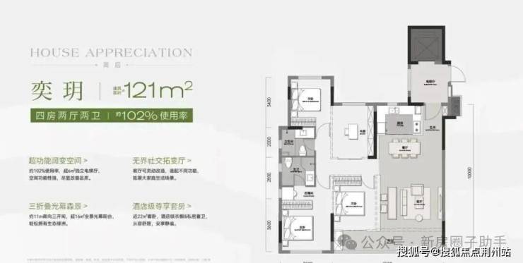 建面约121平四房两卫两卫,优化后约102%得房率: