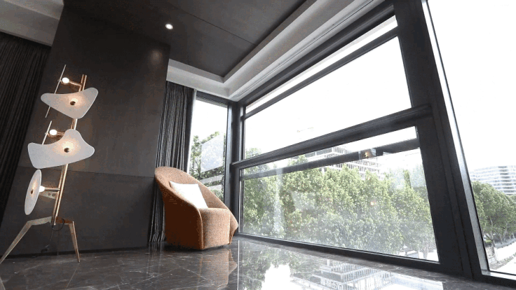 而与其它同类产品不同的是,云合印客厅的南向玻璃是一面约2.4米高的上下电动开启窗,一键开关一秒变阳台,自然风徐徐吹入,阳光洒进客厅,这与24小时一直内循环的主流产品相比,有了更多与大自然亲近的机会。