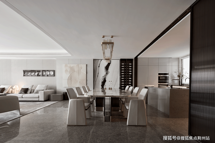 客厅在多重材质的组合下,顺畅融汇 秩序井然素雅的基调来自比例的精准把控和色彩的考究搭配,克制之间彰显出游刃有余的平衡之道!电视背景墙利用石材自身纹理,将水光潋滟的迷人景象引入室内,沙发后方的展示柜高低错落线条置于其上,玻璃和金属交融出迷濛光影!