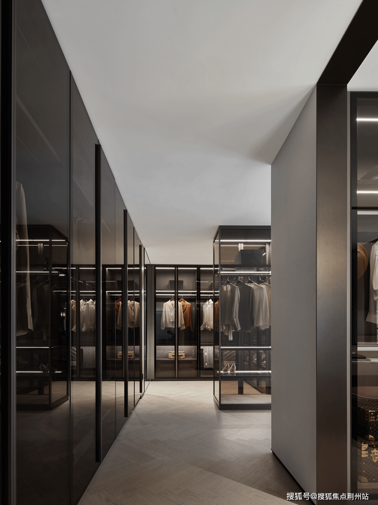从主卧延伸至主卫的步入式衣柜,给予空间更强烈的结构感,对设计美学和功能主义的揉杂进行重新诠释,也将精致生活的幸福主旨排列而开。深色玻璃和金属边条的搭配,给予一丝神秘,透露出隐逸内敛的调性。
