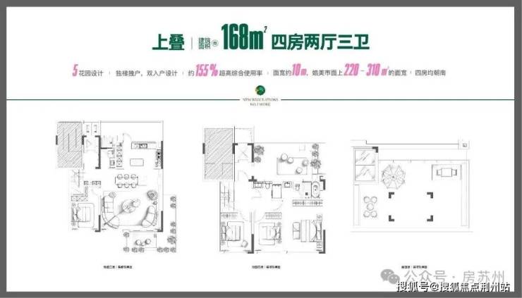 室内4房3卫,综合使用率高达约155%,面宽约10米,媲美市面上220-310㎡的面宽,而且四房全朝南!