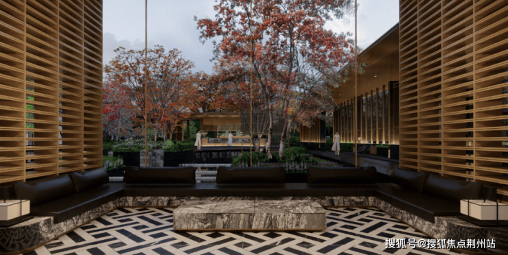 廊畔的核心水院,以“浣溪满庭”为主题打造下沉叠水景观。水流层叠而下,与香橼、红枫、乌桕相映,营造出“明月松间照,清泉石上流”的静谧意境,让归家的最后一段路成为洗去疲惫的疗愈时光。