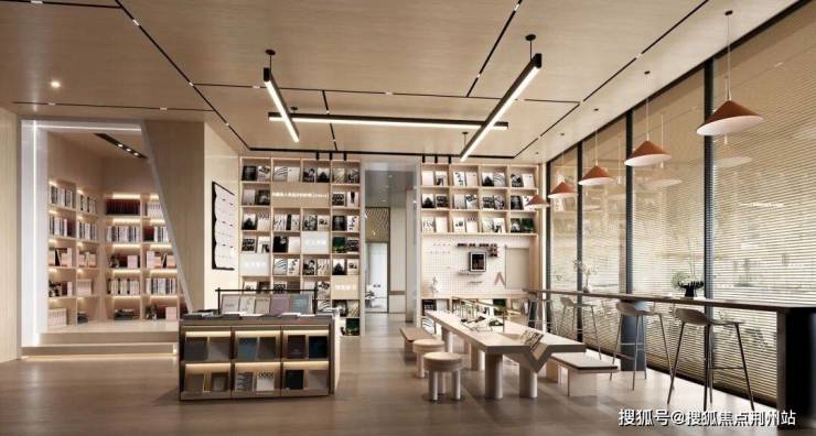 经由礼廊步入约7米挑高的礼序雅馆,我们采用酒店式框景手法打造透镜大堂,以“城市书堂”为理念,设置卡座区和书吧,可以作为接待朋友和访客的会客厅,透过玻璃透镜,便可将内部园林山水提前预览。