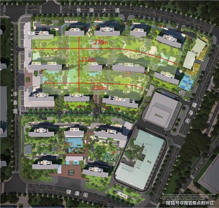 二期共规划12栋15-33层高层住宅,最大约112米南北向纵轴+约270米/约230米东西向双横轴,“两横一纵”-“工”字形架构,营造超开阔、连续、无界的生活场域。