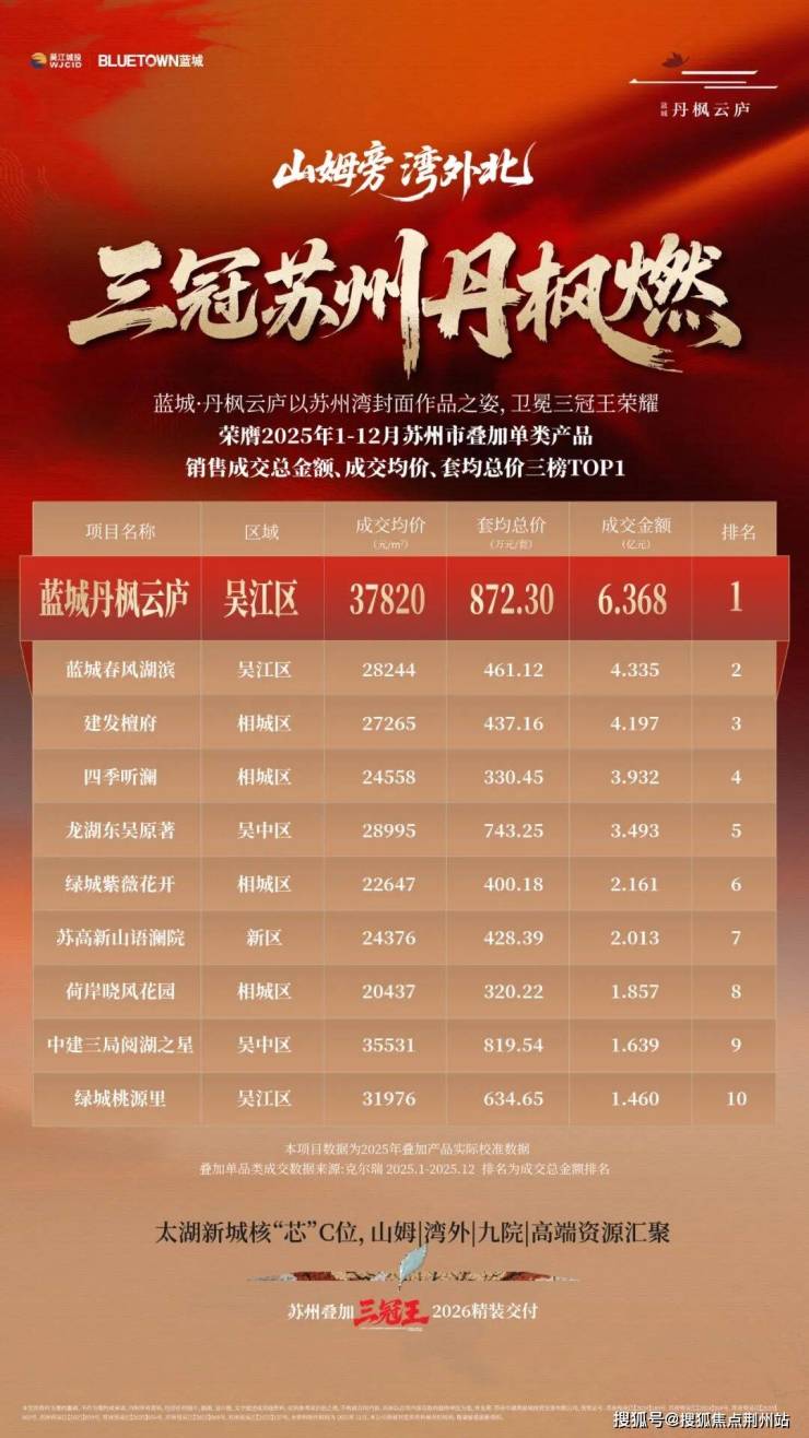 此外,蓝城·丹枫云庐以2025年1-12月成交数据荣膺苏州叠加市场“三冠王”。(数据来源于克而瑞)这从市场端构成了对山姆选址的强力回应。商业巨头带来繁荣,高端住宅则以优质产品力将预期转化为现实,并吸引与之匹配的圈层,二者形成了“商业赋能居住,居住反哺繁荣”的良性闭环。这场“双向认证”,共同锚定了板块的高能级发展。