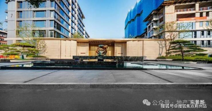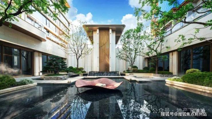 社区园林景观也很讲究,如下沉庭院里,大约10米高的巨幅金属水幕,是以山东博物馆镇馆之宝“九旒冕”为设计灵感,借鉴其垂帘元素,设计而成。目前已实景呈现,可以实地感受一下,镇馆之宝再设计后的水幕之美。