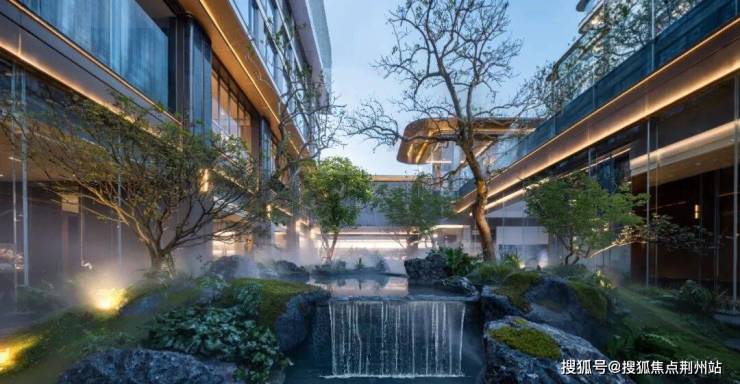 它的立面呈现同样是金沙的封面级作品。整个项目外立面采用大面积low-e曲面玻璃幕墙,并且消隐了常规玻璃面的横挺与竖挺,让外立面呈现出通透流丽的全面屏质感。用金属质感线条+基座石材作为装饰,形成公园里的地标。