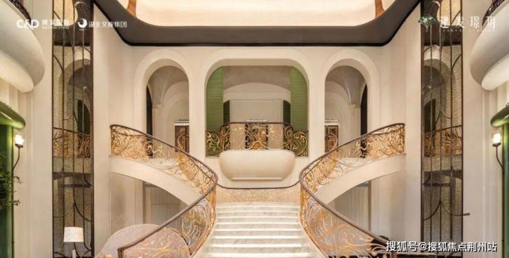 穿过大门就进入了挑高约10米的中庭,这里也是会所的接待大堂,借鉴了厦门千万级豪宅宸启瑞湖的海派美学基因。花瓣式艺术吊灯、南洋釉彩地砖、Art Deco珐琅彩玻璃、双向旋转楼梯......每一处细节,都是对卓越品位的精准表达。