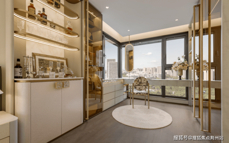 项目远观即具辨识度,这源于对设计语言的极致兑现。香槟金色铝板通过约45°斜切工艺,在光影下形成丰富的层次;独创的“展翼飞檐”屋顶以现代技艺复刻中式神韵;局部高达约35%的窗墙比与约270°环幕窗面设计,不仅塑造了建筑的通透美感,更将“IMAX级”采光视野真实赋予生活。