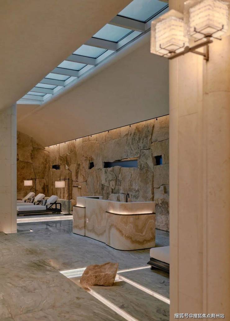 面对数百块、60余吨天然毛石塑造泳池墙面的挑战,项目团队运用数字化选材、1:1地面预拼装、模块化运输与微差调节安装体系,实现了粗犷原石与精细空间的完美融合,成就了兼具自然野性肌理与精准空间叙事的艺术品。