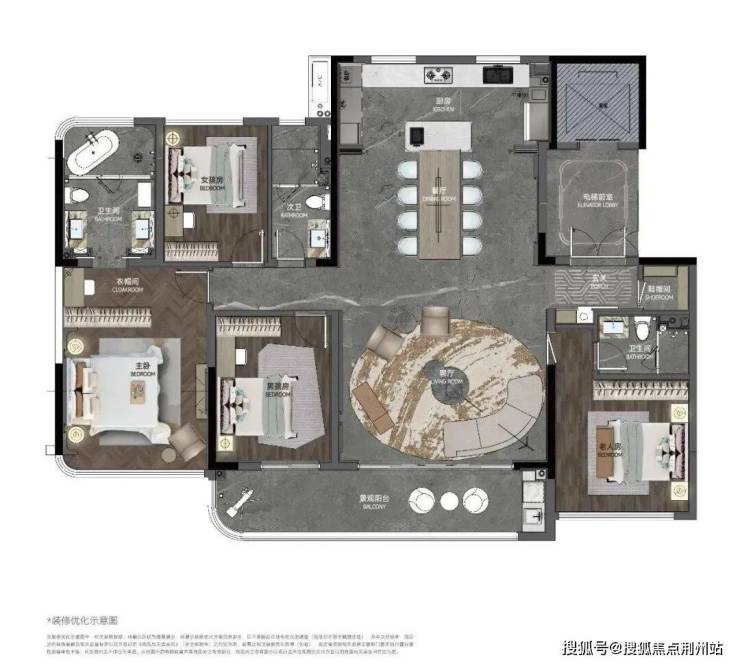 建面约168㎡户型,独立电梯厅入户,南向双套房设计,超大南向观景阳台,串联南向次卧及客厅,主卧、主卫270度采光。