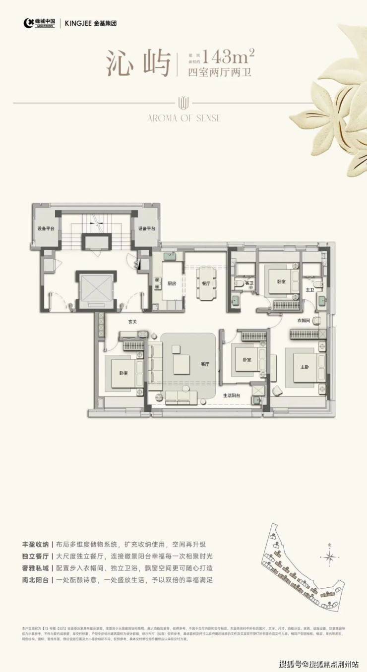建面约143㎡四房两厅两卫,270°转角飘窗,四开间朝南,南北双阳台设计,独立餐厅+北阳台,南向双联阳台。