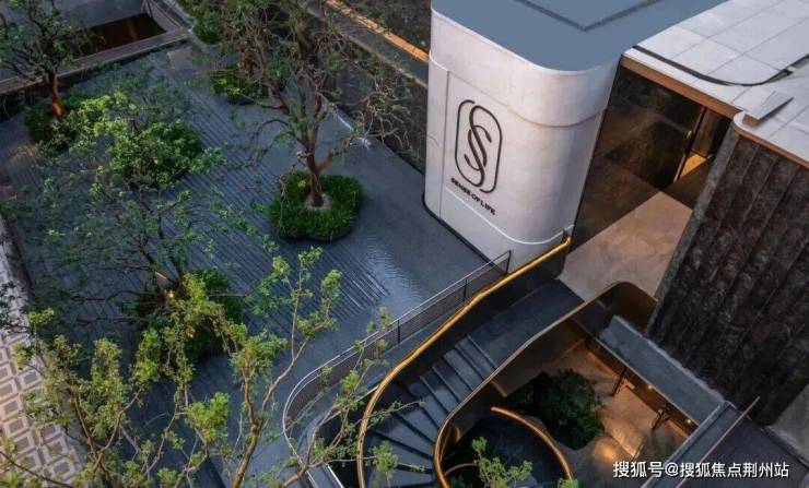 穿过小区大门后,眼前呈现一派绚烂水景,视野豁然开朗:五株婀娜香橼树在花坛中随风轻摆;叠层水幕沿着碧潭金沙、蓝眼睛花岗岩台阶潺潺流淌,营造出宁静祥和的归家心境。
