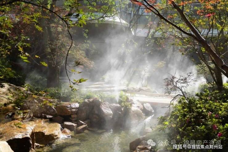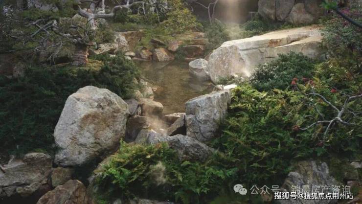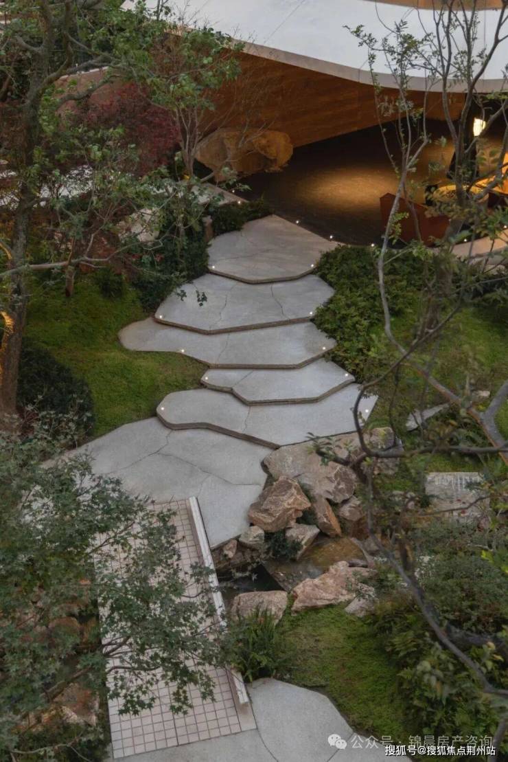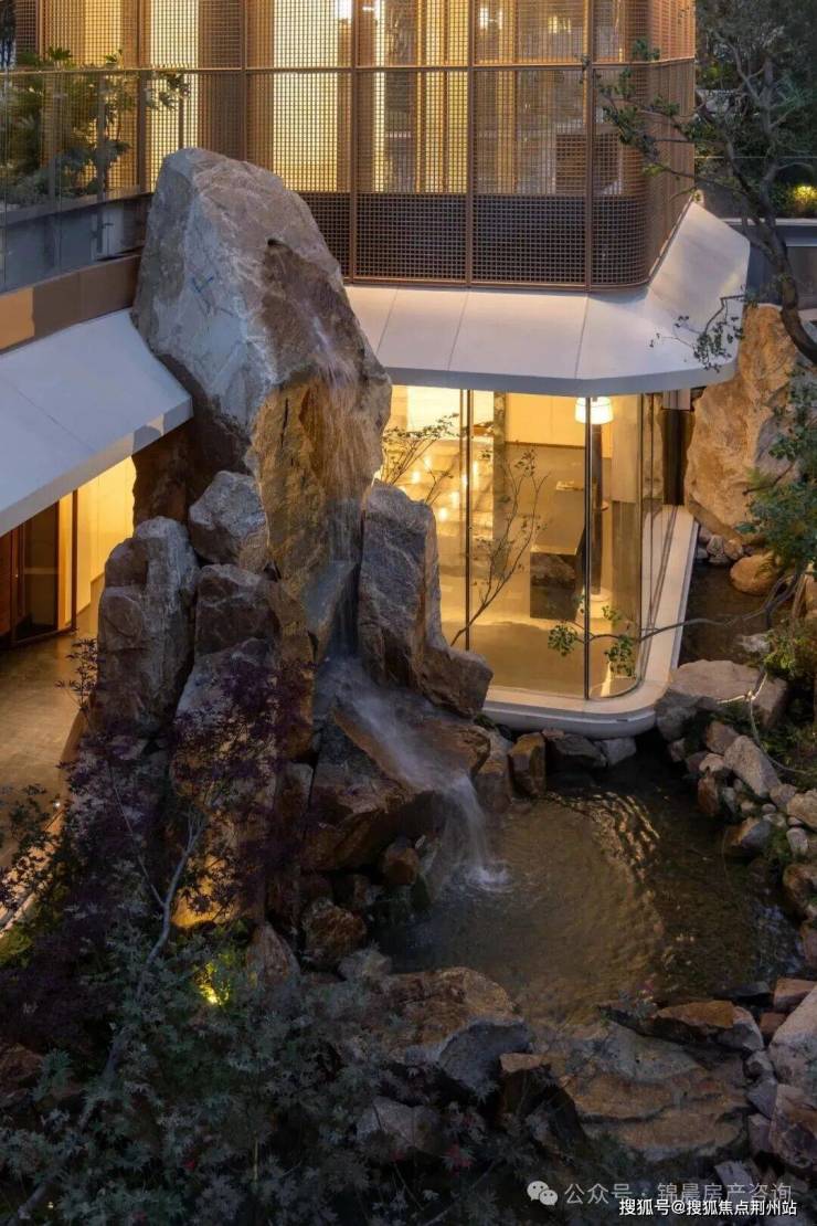哪怕在园区走马观花一遭,也随时随地为触目可及的格调和韵味叹为观止。石材景墙叠砌,前面是朴树红梅紫薇,背后透出苍郁青峰,隐与奢共绘“千里江山”。立面造型竹韵温润,围界选材烁如黄金,合谱一曲“金玉满堂”。毛石墙面,自然肌理,实木椅子,坐感舒适,格栅梳理光线,花艺表达四季,一起赶走疲倦,松弛出舒适。三层台地,可行,可望,可游,可居,具象化了“溪山行旅”,璞岩叠谷,老树、巨石、飞瀑、软瓷岩壁,向崂山元素致敬。