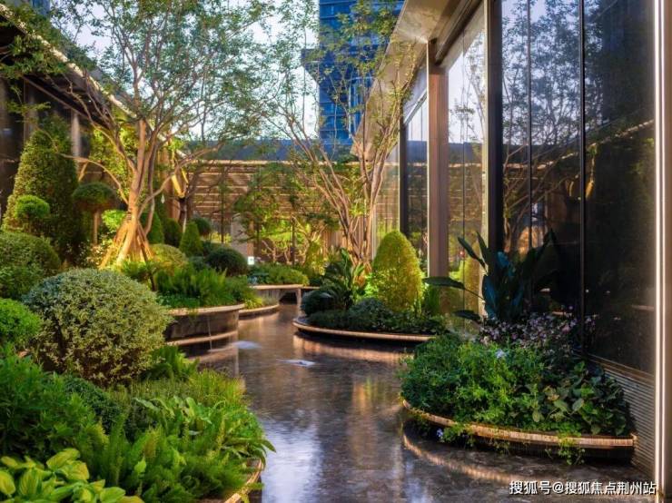 地库光厅全金属漆吊顶,彰显品质感,地面采用石材拼花设计,周边设置枯山水景观。
