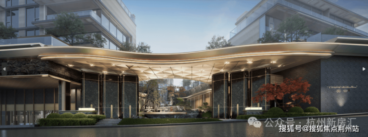 把小区大门做大、做宽,在杭州已经不算稀奇。安云玖院不止为36户业主设计了尺度阔的豪华大门,还在门内打造了一座七米高的飞瀑景观,让大门本身成为小区重要的景观节点。
