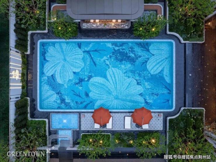 泳池底部海棠花影美轮美奂,两侧乌桕矗立,4棵铁冬青分列泳池四周,超7米宽泳池社交吧台、下沉围坐区,对望超16米宽跳泉叠瀑,瞬间把松弛感拉满。