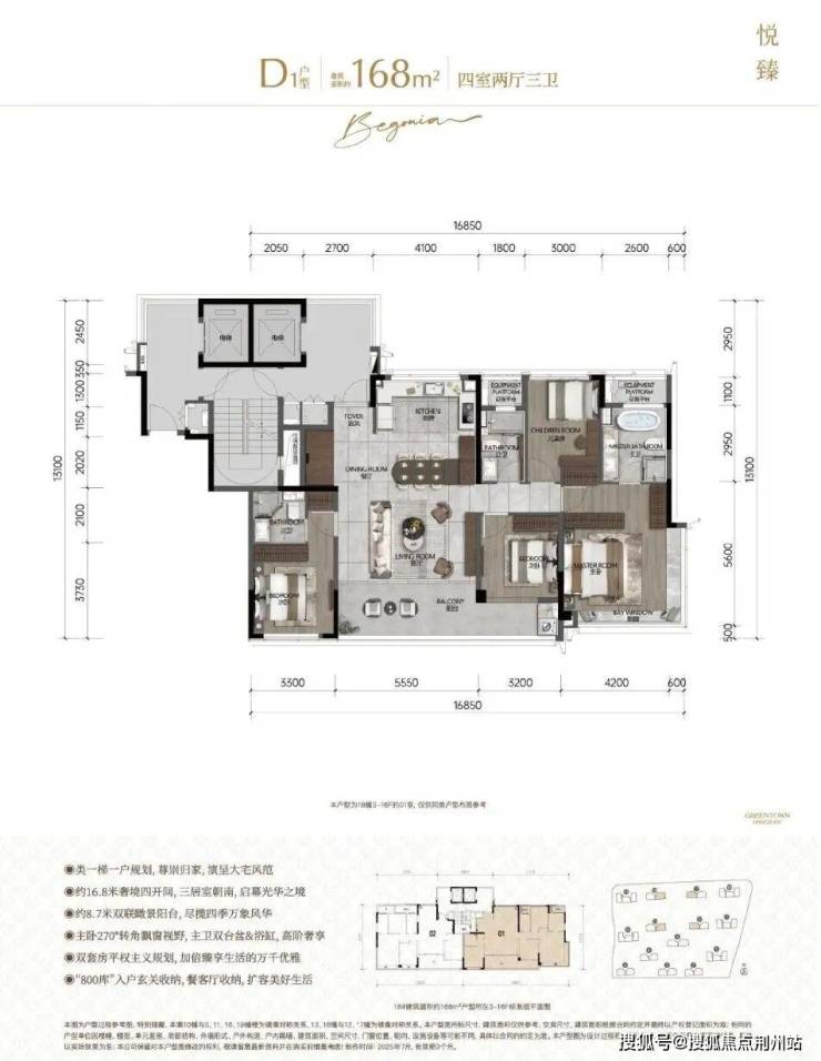 建面约168方D1户型:类一梯一户,花园式电梯前厅,南向双套房,堪称三代同堂家庭的完美搭子!