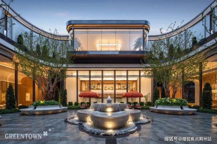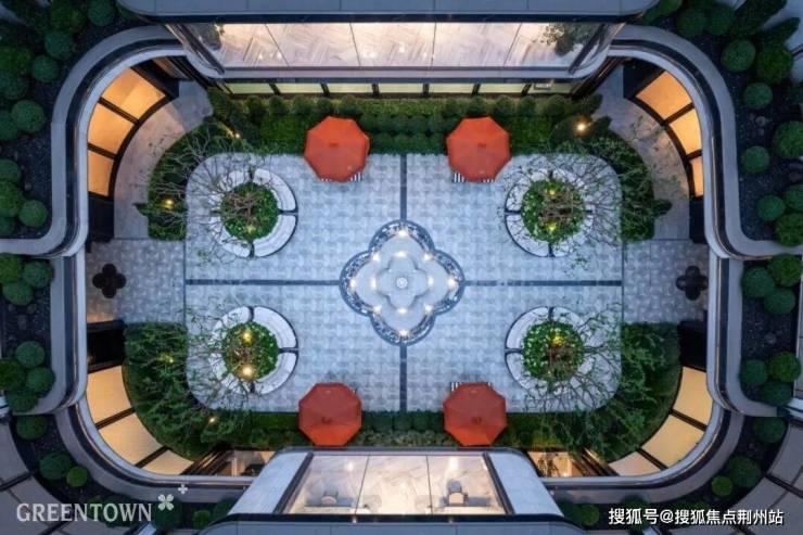 站在回廊上,俯瞰下沉式庭院,这里水花飞溅,4棵紫薇树对称排布,既新奇又有游园之趣。