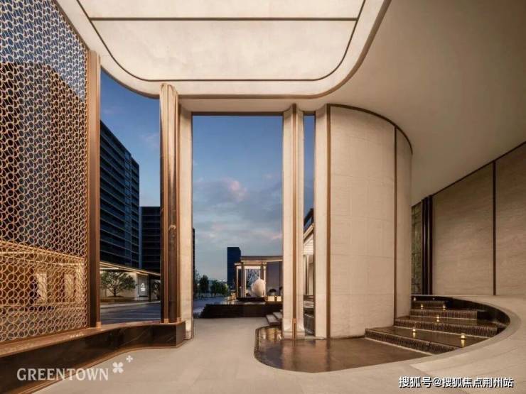 地上会客厅大堂前场汲取迪拜THE LANA酒店灵感,打造流畅圆弧形书页式吊顶“无界之镜”,超大落地玻璃,框出旖旎风景,别有一番韵味。