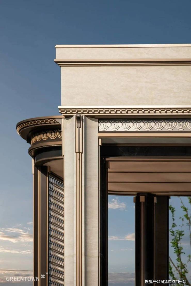 主入口“学院派”门厅,长约45米,采用双C环抱式造型,设计灵感源自西湖大学,两侧约7米高宝格丽绿奢石景墙,搭配汉白玉奢石海棠雕塑,超强气场扑面而来。