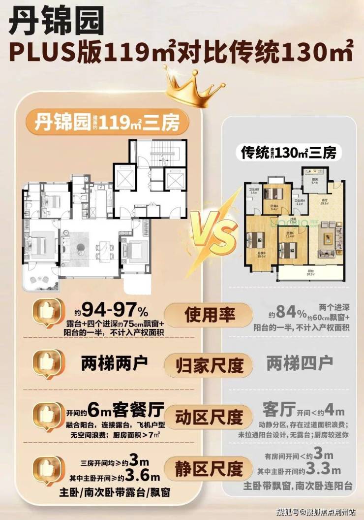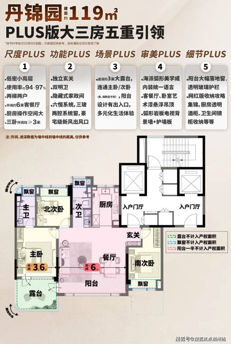 经过测算,丹锦园建面约119㎡使用率达约94-97%,相当恐怖。小高层本就有优势,再加上大露台+四个进深约75cm飘窗+阳台一半不计入产权面积,轻松超越传统130㎡。