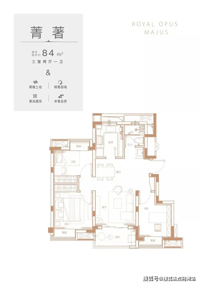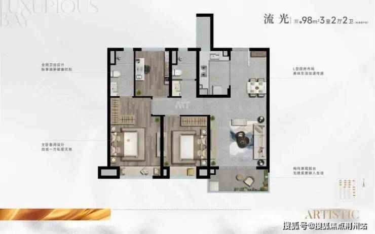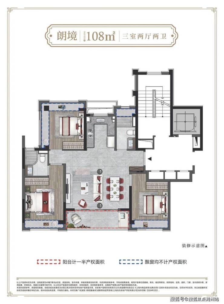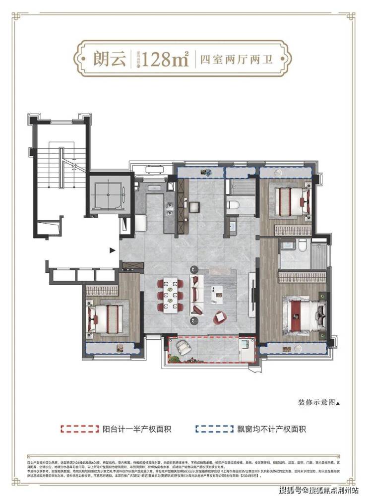 户型满足大面宽、短进深的要求,108、128平产品都做到四开间朝南。