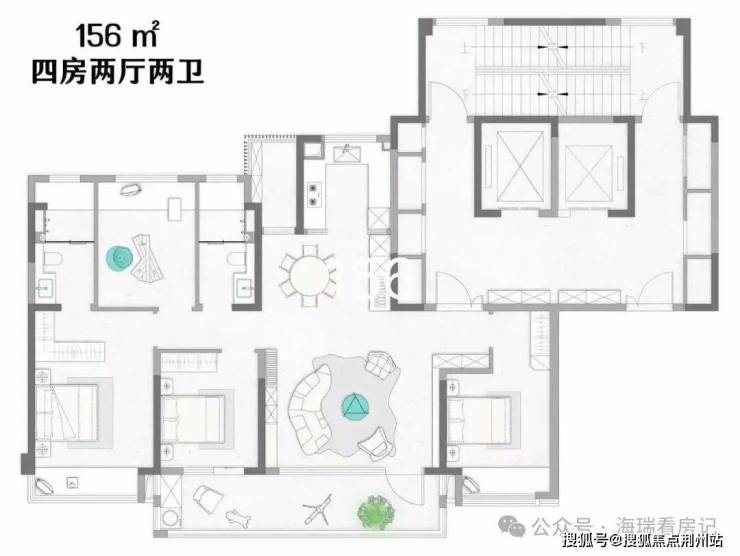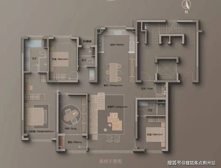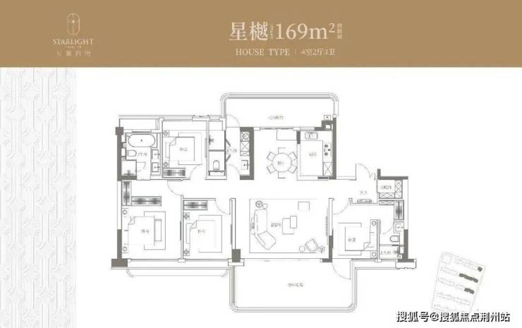 四房两厅三卫户型,三卧室朝南+南向双套房,私密性与舒适感兼具,星级酒店式主卧套房尺度感拉满。
