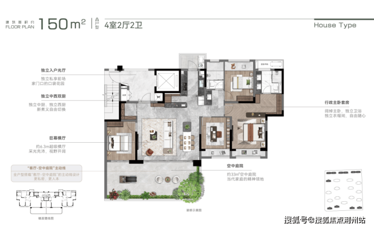 南北庭院+超感动线空间+超前精研细节+超级附加,这样的设计将传统公摊劣势转化为“空中领地”的增值优势,把大平层户型别墅化,让业主拥有双重居住体验。