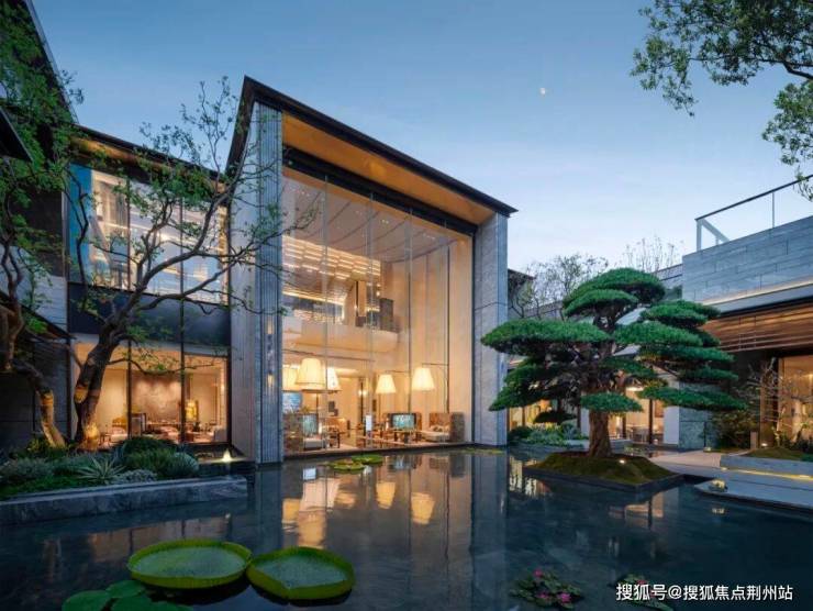 凤起冕旒|东方礼序的当代演绎;主入口门头以古代礼冠“冕旒”为灵感,采用现代设计语汇,构筑约85米“凤起冕旒”华贵门仪。景泰蓝垂幕「旒珠振玉」镶嵌其间,既呼应传统东方礼制,亦致敬苏州的时代封面与源点气质。门庭景观取罗汉松、朴树等珍稀树种,将奢石、水景与自然精巧融合,构筑一方承袭千年盛韵的尊荣之境。
