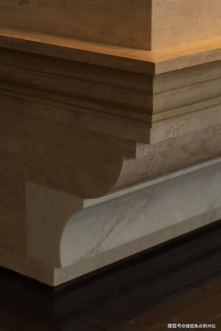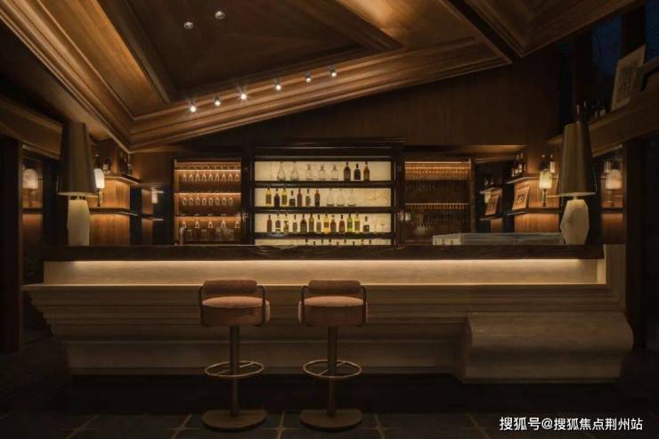 木质界面与暖调灯光构成稳定背景,错置的细节在克制中带来轻松感。吧台以多种石材拼贴,通过简化的几何切割,回应古典镶嵌工艺。墙面线条被重新组织,串联起酒柜、书架与垂直动线,让空间在秩序中保持流动。