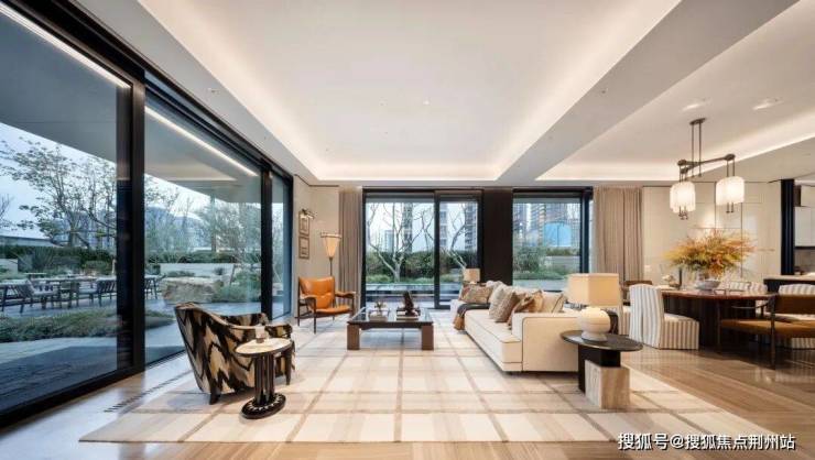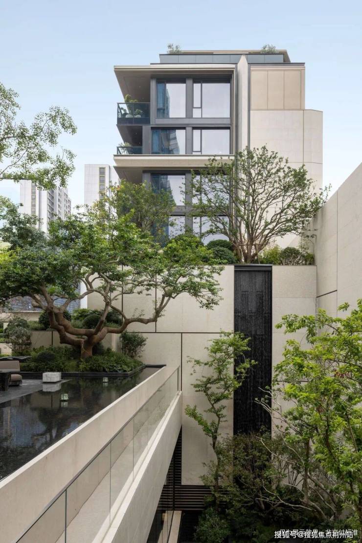 其次是建筑采用经典的三段式立面,集合仿石铝板、三玻两腔LOW-E玻璃和香槟色铝板线条,形成方正有序的框感,既有超奢美学,也把每一户的居住领地感拉到极致。