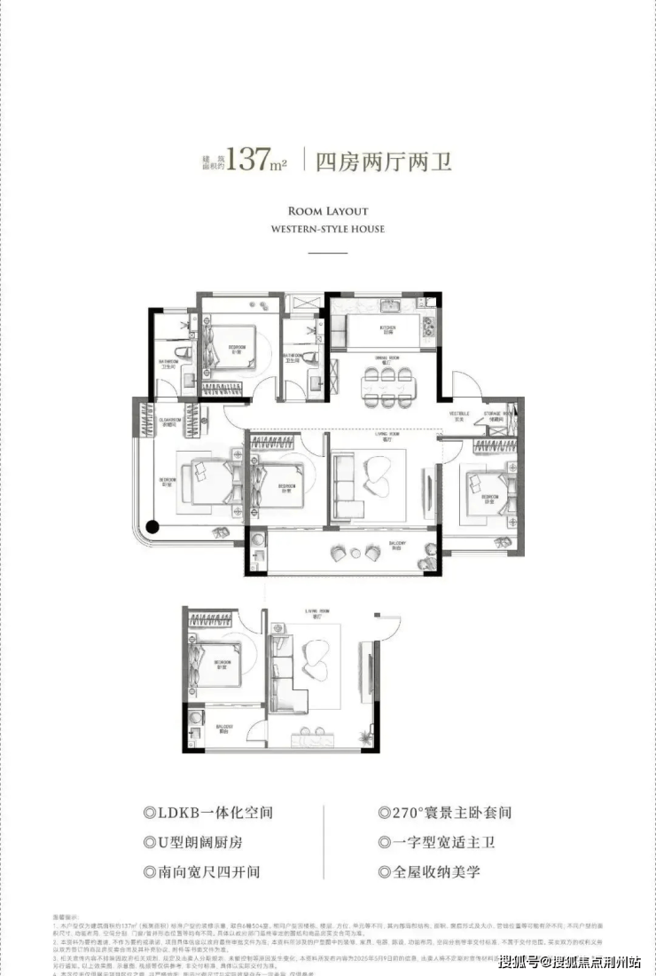 137㎡户型:4房2厅2卫,超大南向开间,公区采用LDKG设计,搭配双联阳台,主卧套房带有270°L型飘窗。