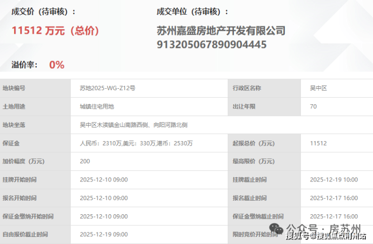 其前身为苏地2025-WG-Z12号地块,去年12月土拍中,由嘉盛房地产底价竞得,成交总价11512万,成交楼面价13560元/㎡。