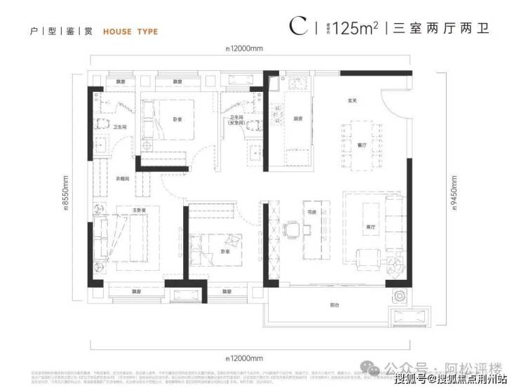 建面约125平C户型:6号楼边套,3+1房两厅两卫设计,户型很方正,南向客厅和书房打通,开间会比较大,但如果南向书房隔成一间房,客厅则会显得非常局促。