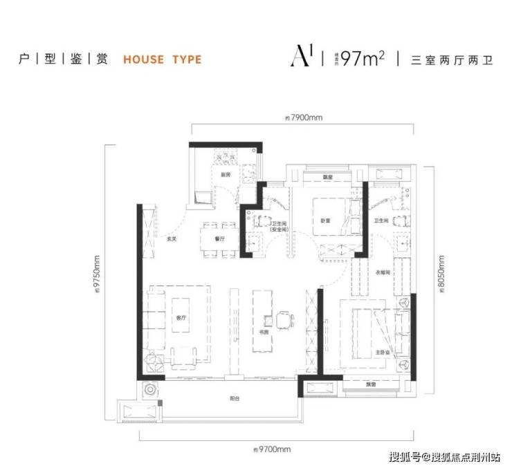 建面约97平三房两厅两卫,传统中间户,3开间朝南,北面对连廊。