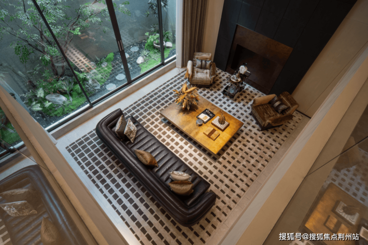地下恒温泳池三面采光,顶部是15米玻璃天顶倒映着空中花园水景,泳池底部300万片马赛克拼出名画《睡莲》局部。两侧黑色铁艺屏风外是下沉庭院,让业主在游泳的同时也可看到外部的自然景观。