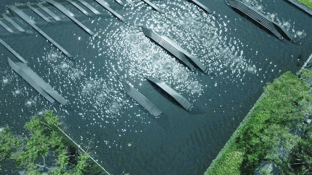 并通过跌水、涌泉和镜面水景等水景组合,将内部水景与外部水岸紧密相连。