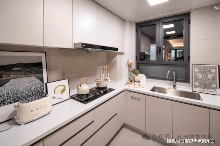 厨房操作台面空间充足,并提前预留有双开门冰箱位置,同样提前展示了强大的厨房收纳功能。