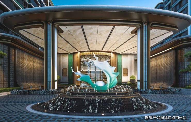 广场地面采用精密拼缝的编织纹铺装,中央是圆形水台,黑色盾形石如龙鳞叠砌,水流贴合着石材曲面温柔下滑,如缎覆甲。