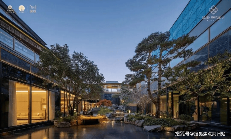 步入正门,一座高度逾40米的宏伟大门巍然矗立。门楣中央镶嵌着圆润对称的团扇造型门饰,其流畅的轮廓线条既构建了归家途中的首重仪式空间,亦寄托着团圆美满的生活寓意。团扇门前,佩环状玉石雕塑静置水畔,取“君子如玉”之意,潺潺流水映衬其间,为场景平添灵动气韵。