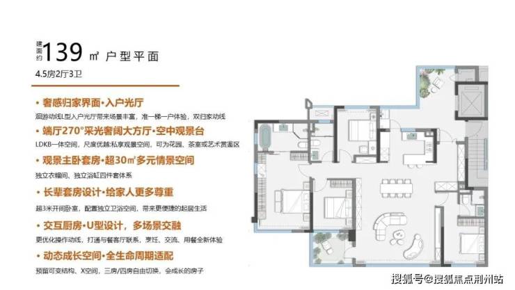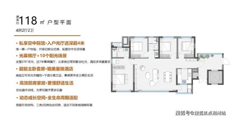 区别于传统的“T字型”和“工字型”T4,除了每一户都有全明电梯入户空间,金茂晓棠还调整了产品格局,将东侧翅膀户主景观面由朝北变为朝东,直看中庭,让每一户都能享受270°景观面。
