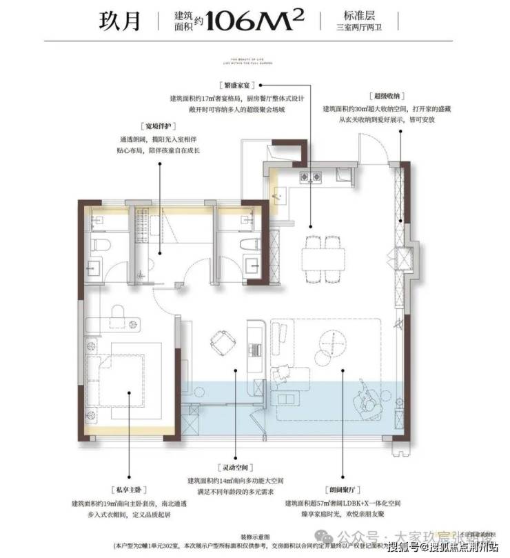 建面约106㎡「玖月」三室两厅两卫,打造约57㎡LDKB+X一体化宽厅,搭配全维度超强收纳系统,是刚改家庭的高性价比优选。